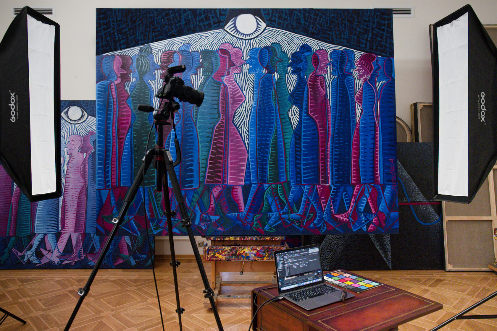 In the end, all works larger than one and a half meters were captured using a panoramic method — in parts, then stitched into a single image. This approach eliminated glare and achieved very high detail.